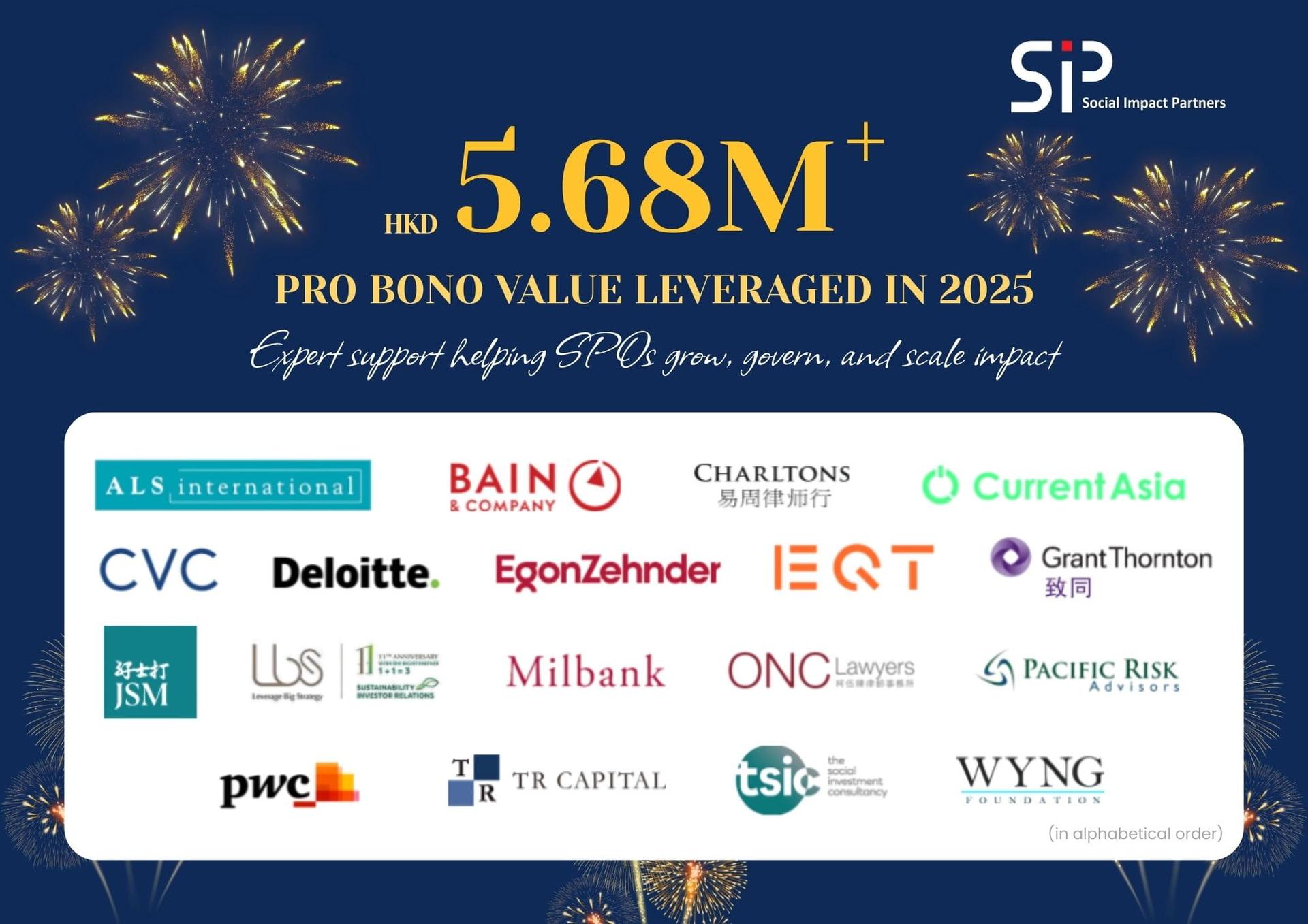 In 2025, SIP’s pro bono support reached over HKD5.68M, our highest value ever! We would like to express our utmost gratitude to the generosity and expertise offered by our partners, which allowed our SPOs to receive crucial support across legal, governance, finance, valuation, strategy, HR, and communications, helping them strengthen foundations and scale impact sustainably. We are deeply grateful to all our 2025 pro bono partners for being an essential part of the SIP ecosystem. If your professional firm wishes to contribute your expertise to our cause, we warmly welcome you to join our Pro Bono Partner Network.