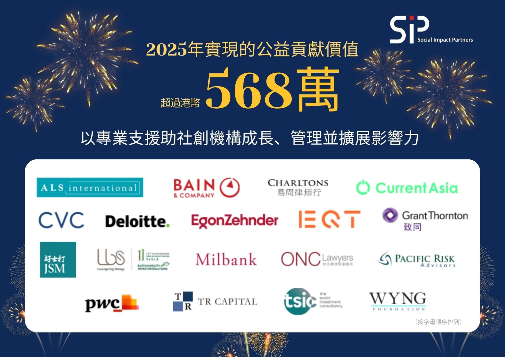 在2025年,SIP的義務專業支持總值超過港幣568萬元,創下歷史新高!感謝各位夥伴的慷慨與專業,我們的社創機構在法律、治理、財務、估值、策略、人力資源及傳訊等各方面都獲得了關鍵支援,幫助它們鞏固基礎並可持續地擴大影響力。我們衷心感謝所有2025年的義務專業夥伴,感謝你們成為SIP生態系統不可或缺的一部分。若您的專業機構也希望貢獻專長,我們誠摯歡迎您加入成為策略夥伴一份子。